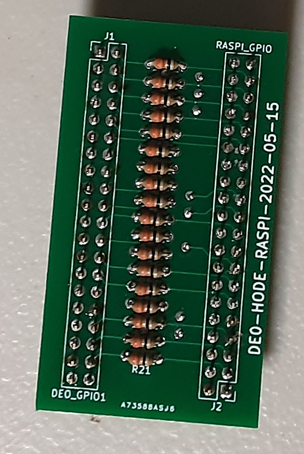 Interesting note: The interconnection board isn't Hode specific as such, it can be used for other projects requiring up to 26 directly connected GPIO lines between a Raspi and a DE0 Nano. |